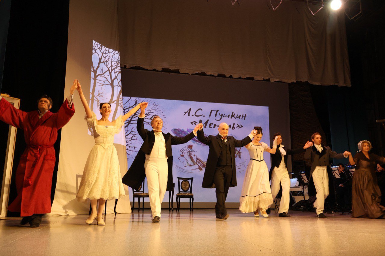 Спектакль, созданный по мотивам бессмертной повести Александра Пушкина, с первых минут погрузил зрителей в атмосферу роковой случайности и судьбоносных предзнаменований. Основой магического действа стала не только мощь пушкинского слова, но и гениальная музыка Георгия Свиридова, чей оркестровый цикл к повести давно признан самостоятельным шедевром. Живое звучание оркестра под управлением заслуженного артиста России Бориса Бенкогенова объединило все элементы постановки.