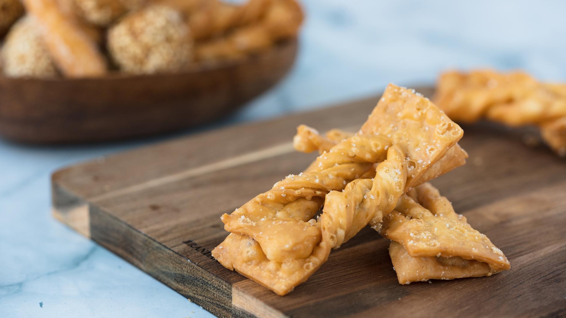 Затем тесто нужно тонко раскатать и разрезать на ромбики. Посередине каждого следует сделать разрез, а через него вывернуть край изделия.