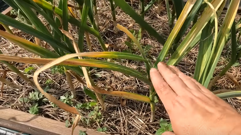 - Начинать проверку с 10 июля, обращая внимание на нижние листья: у зрелого чеснока нижние 2–3 листа будут желтыми, а верхние — зелеными.