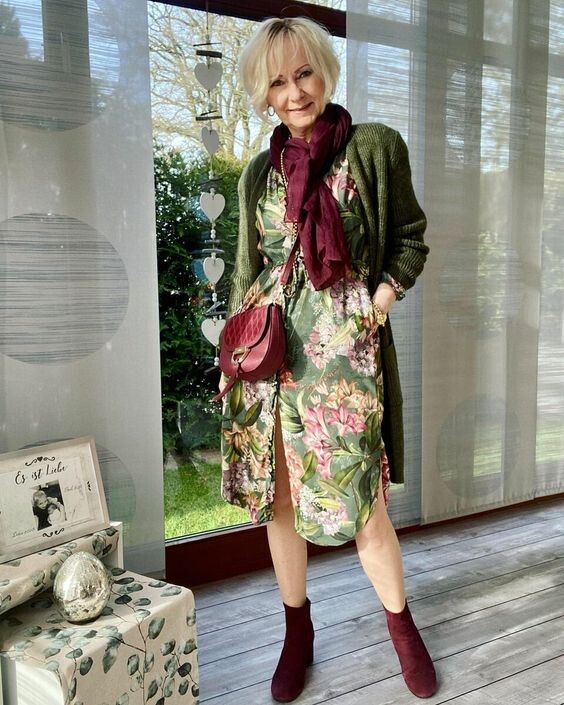 1. Яркое платье-рубашка с насыщенным цветочным принтом в розово-зеленых оттенках станет отличным выбором для создания стильного образа. Совместите его с удлиненным тёмно-зелёным кардиганом без застежки и добавьте темно-бордовый шарф для акцента. Удобные ботильоны на устойчивом каблуке завершат наряд.