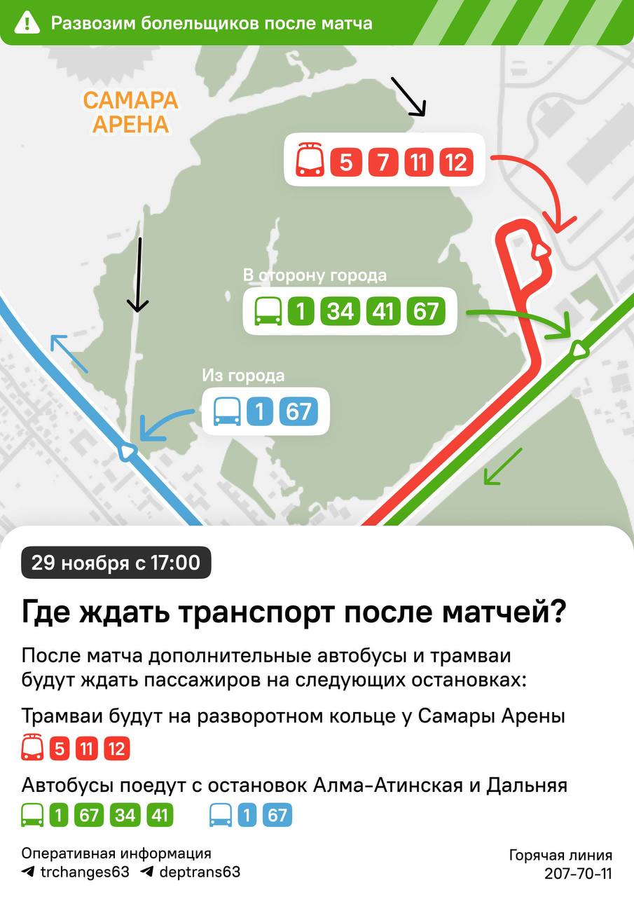 К 17:00 МП «Трамвайно-троллейбусное управление» подаст на остановку «Самара Арена» дополнительный подвижной состав трамвайных маршрутов №№ 5, 11, 12, в том числе запланированы низкопольные трамваи;