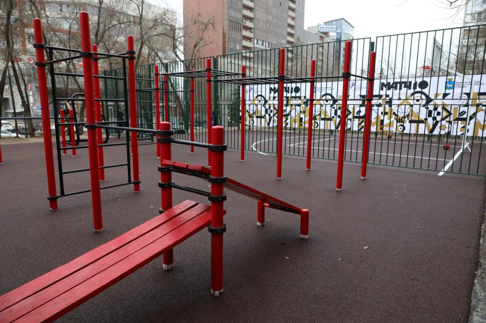 На территории спортивной площадки располагаются функциональные тренажеры для различных групп мышц, площадки для бадминтона, стритбола, стол для игры в шахматы и шашки. Пространство является адаптивным и предназначено как для детей, так и для людей с особенностями здоровья.