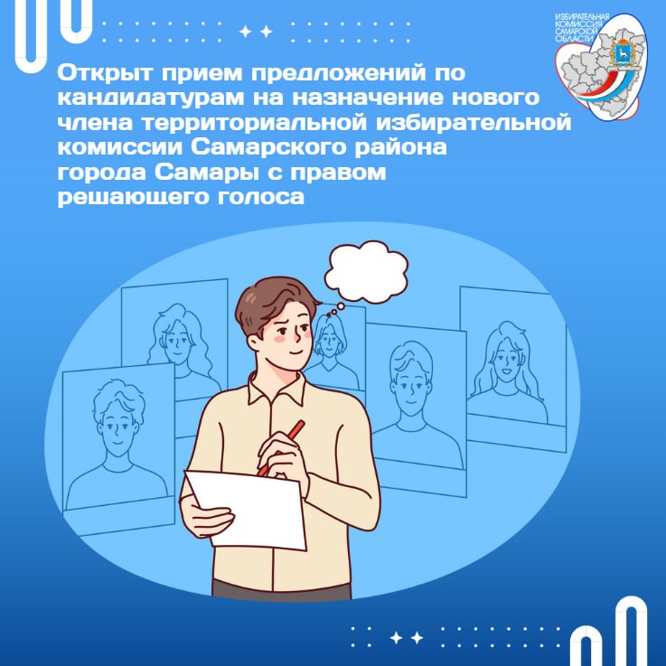 Избирательная комиссия Самарской области объявляет о приеме предложений по кандидатурам на назначение нового члена территориальной избирательной комиссии Самарского района города Самары с правом решающего голоса.