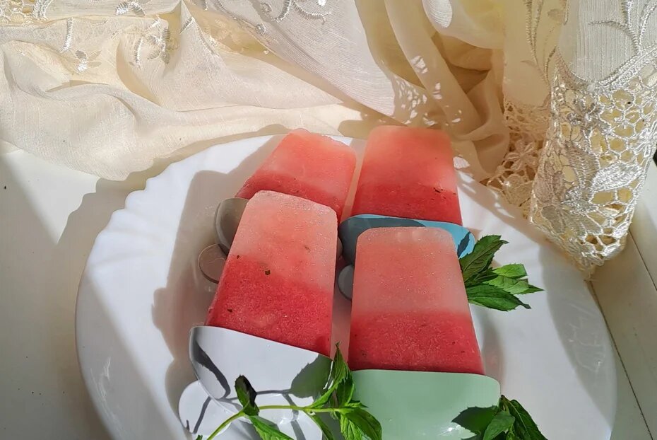 Первым делом соберите все необходимые ингредиенты.Разрежьте арбуз и извлеките мякоть, нарезав ее на крупные кубики, предварительно убрав семена.Поместите нарезанную мякоть арбуза в чашу блендера.Добавьте в блендер столовую ложку свежевыжатого лимонного сока.Тщательно промойте свежие листья мяты, отделите 5 шт. и добавьте в чашу блендера.Измельчите все ингредиенты до однородного состояния с помощью погружного блендера.Уберите образовавшуюся пену с поверхности.Влейте чайную ложку меда и слегка перемешайте.Промойте формы для мороженого и дайте им обсохнуть.Заполните формочки получившейся смесью, накройте каждую из них крышкой.Поставьте формы в морозильную камеру минимум на 4 часа для полной заморозки.Перед подачей на стол, чтобы легче достать лед, опустите формы в горячую воду на 5 секунд и аккуратно выньте готовое мороженое.Этот восхитительный десерт на основе арбуза станет отличным способом украсить ваш летний день, добавив нотки свежести и удовольствия в каждую порцию.