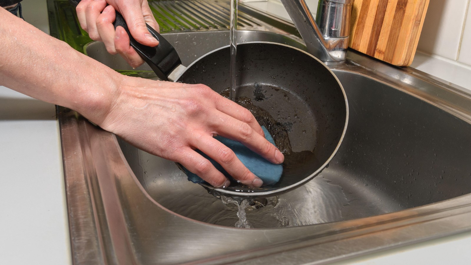Избежать появления налета жира и копоти при жарке нельзя. А отмыть его обычным средством для мытья посуды не получится. Поэтому со временем на обратной стороне сковороды появляется толстый бугристый слой нагара. В Сети есть много советов, как его удалить, но самый простой — раствор аммиака.