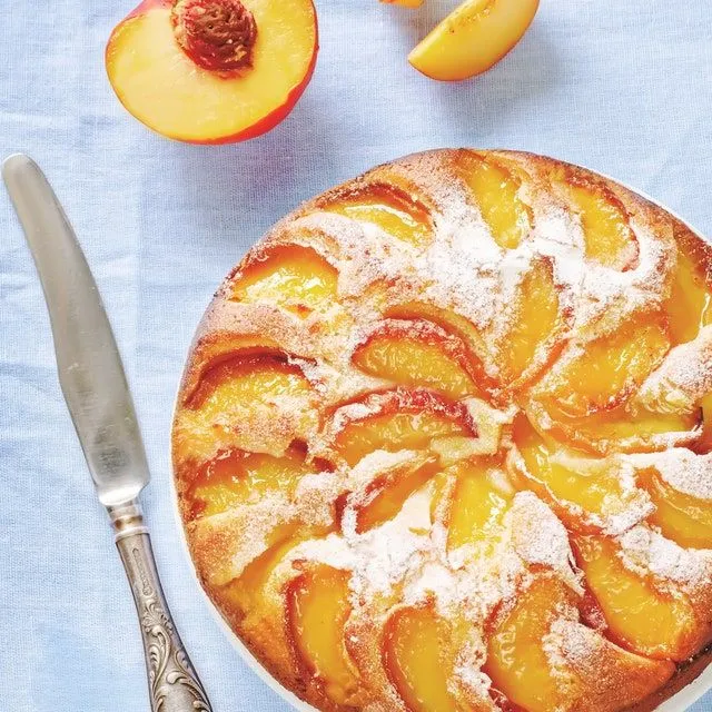 Перелейте полученную массу в заранее подготовленную форму, смазанную маслом и обсыпанную панировочными сухарями. Распределите дольки персиков по поверхности теста так, чтобы они слегка утонули, придавая пирогу сочный вид.