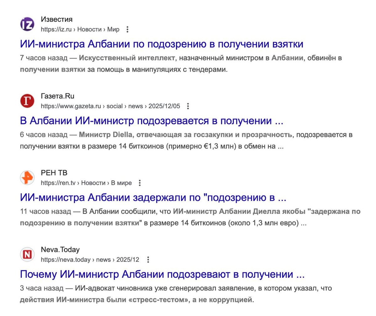 Недавние события в мире медиа вновь поставили под сомнение ответственность новостных изданий за свои публикации. В частности, внимание привлекла информация о том, что ИИ-министра Албании задержали по подозрению в получении взятки в криптовалюте. По данным СМИ, этот виртуальный чиновник якобы получил 14 биткоинов. Подобные сообщения подхватили многие известные издания, включая «Известия», ссылаясь на хорватский ресурс Newsbar, известный тем, что порой публикует шокирующие или сенсационные материалы.