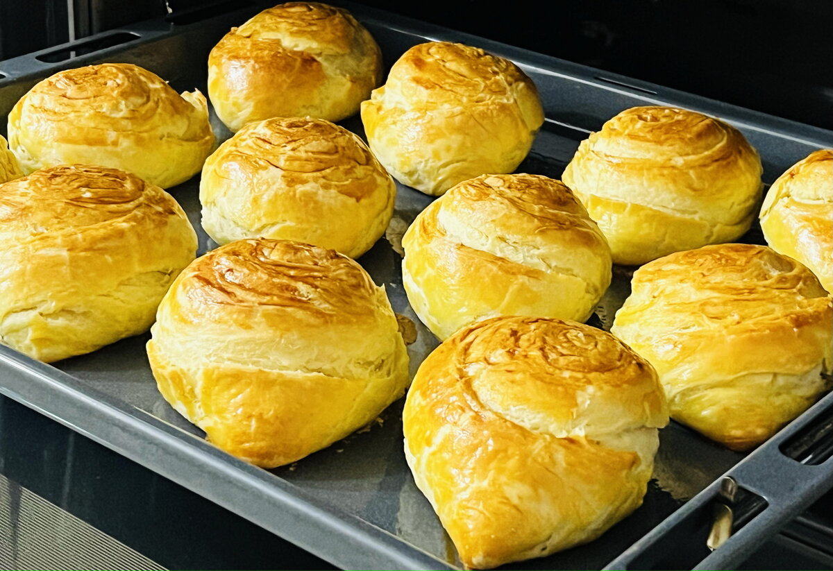 После того как полученные рулеты будут разделены на шесть равных частей, каждую порцию ставят вертикально, делая выемку в центре для начинки. Края теста закрепляются, и формируется выпечка, которая помещается на заранее смазанный противень. Чтобы придать изделию красивый золотистый цвет, верх смазывают желтком. Выпекать в предварительно разогретой духовке на температуре 180 градусов нужно около 25 минут, и прекрасное угощение готово!