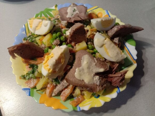 Сначала картофель и морковь стоит тщательно вымыть, завернуть в фольгу и запечь в духовке до готовности. После запекания овощи должны остыть и очиститься от кожицы. В то время как они готовятся, говяжий язык помещается в кипящую воду с добавлением душистого перца и лаврового листа, варится до мягкости, затем охлаждается и очищается. Яйца отвариваются вкрутую, а зеленый горошек необходимо отварить в течение 5 минут.