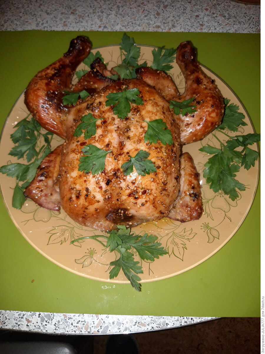 Перед запеканием нужно разогреть духовку до 200°C. Поместить курицу на противень и запекать в течение 40 минут, затем снять фольгу и готовить еще 20 минут для получения золотистой корочки. Часто поливать выделившимся соком. После готовности, украсить свежей зеленью и подать к столу!