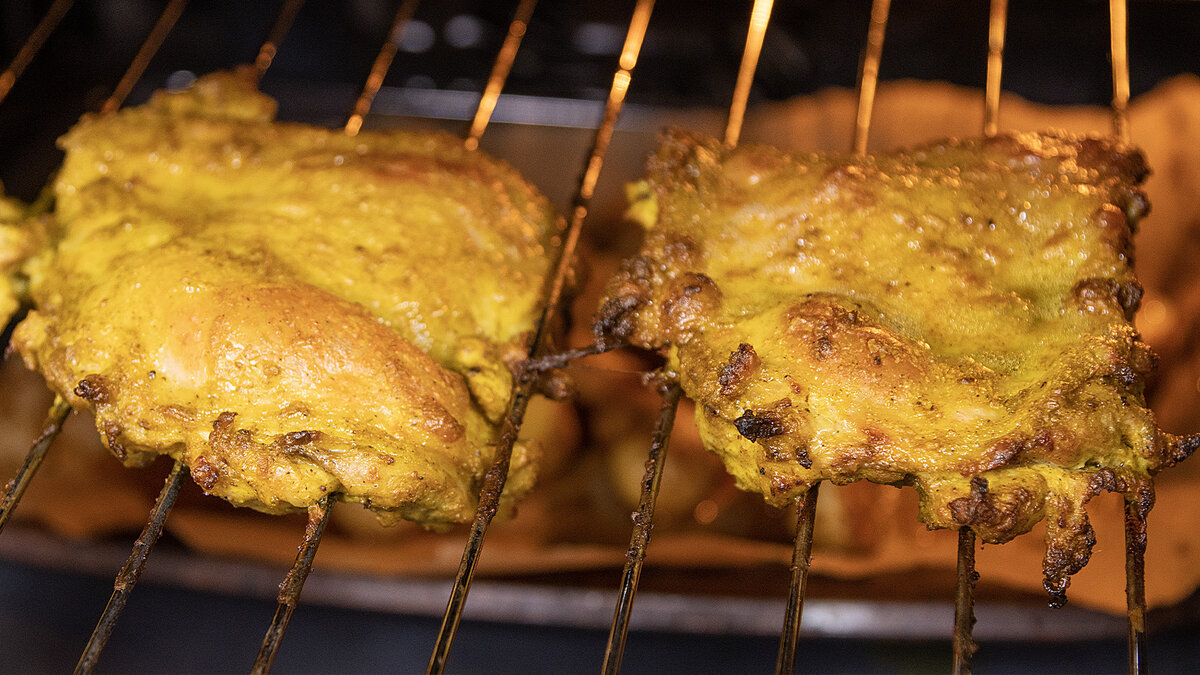 Куриные окорочка осторожно отделяются от костей, после чего их приправляют сухим чесноком, куркумой, копченой паприкой и специями. Для создания особого вкуса, к курице добавляют кефир, соль, перец, майонез и сбрызгивают лимонным соком. Вся эта ароматная смесь тщательно перемешивается.