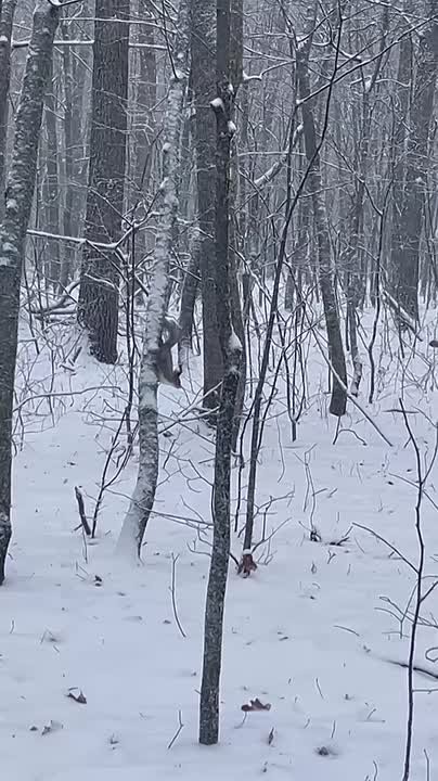 Посмотрите, какие трюки выполняет белочка среди заснеженных деревьев.