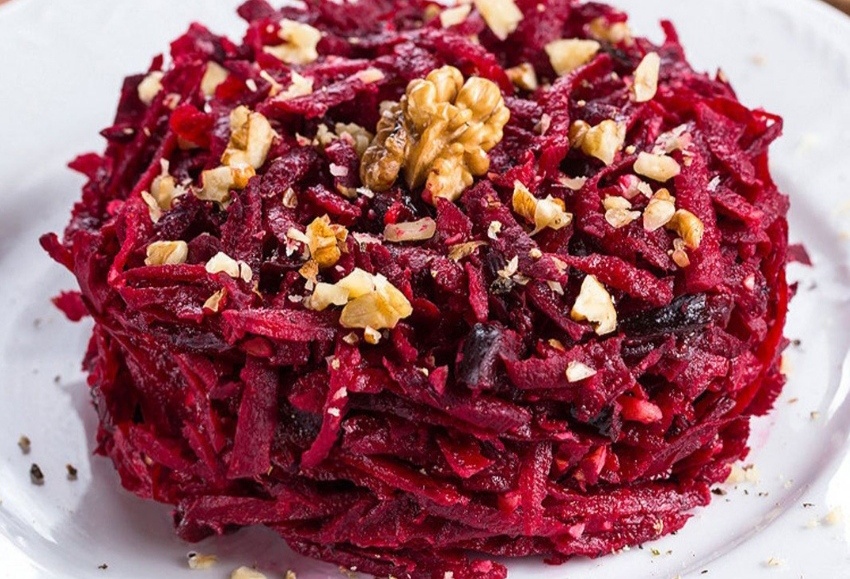 Приготовление: свеклу можно отварить в мундире или запечь в духовке. После остывания очистите и натрите на крупной терке. Лук нарежьте мелкими кубиками. Все ингредиенты соедините в одной емкости, добавьте консервированную фасоль, посолите, поперчите и заправьте майонезом. Перед подачей посыпьте салат измельченными грецкими орехами.