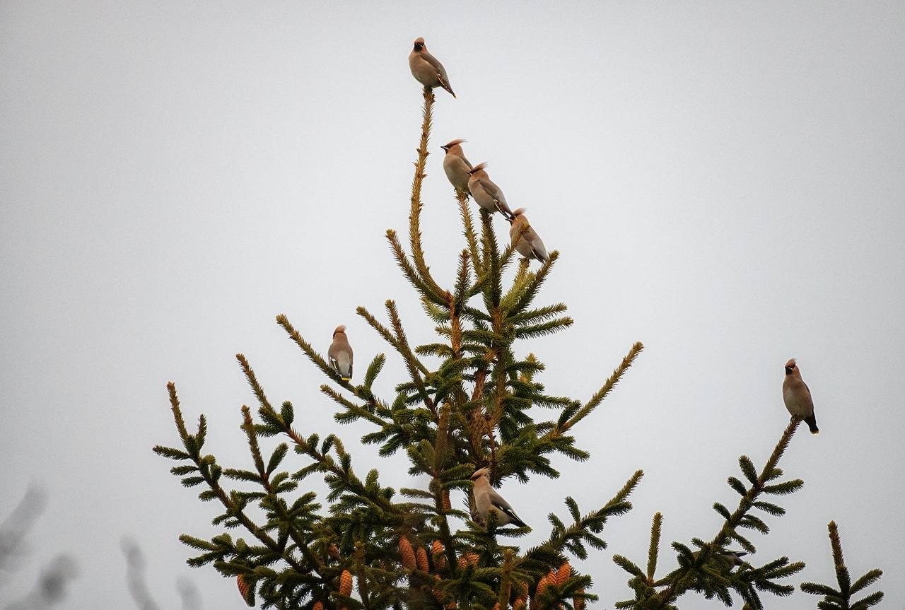 Птицы словно новогодние игрушки украсили красавицу елку
