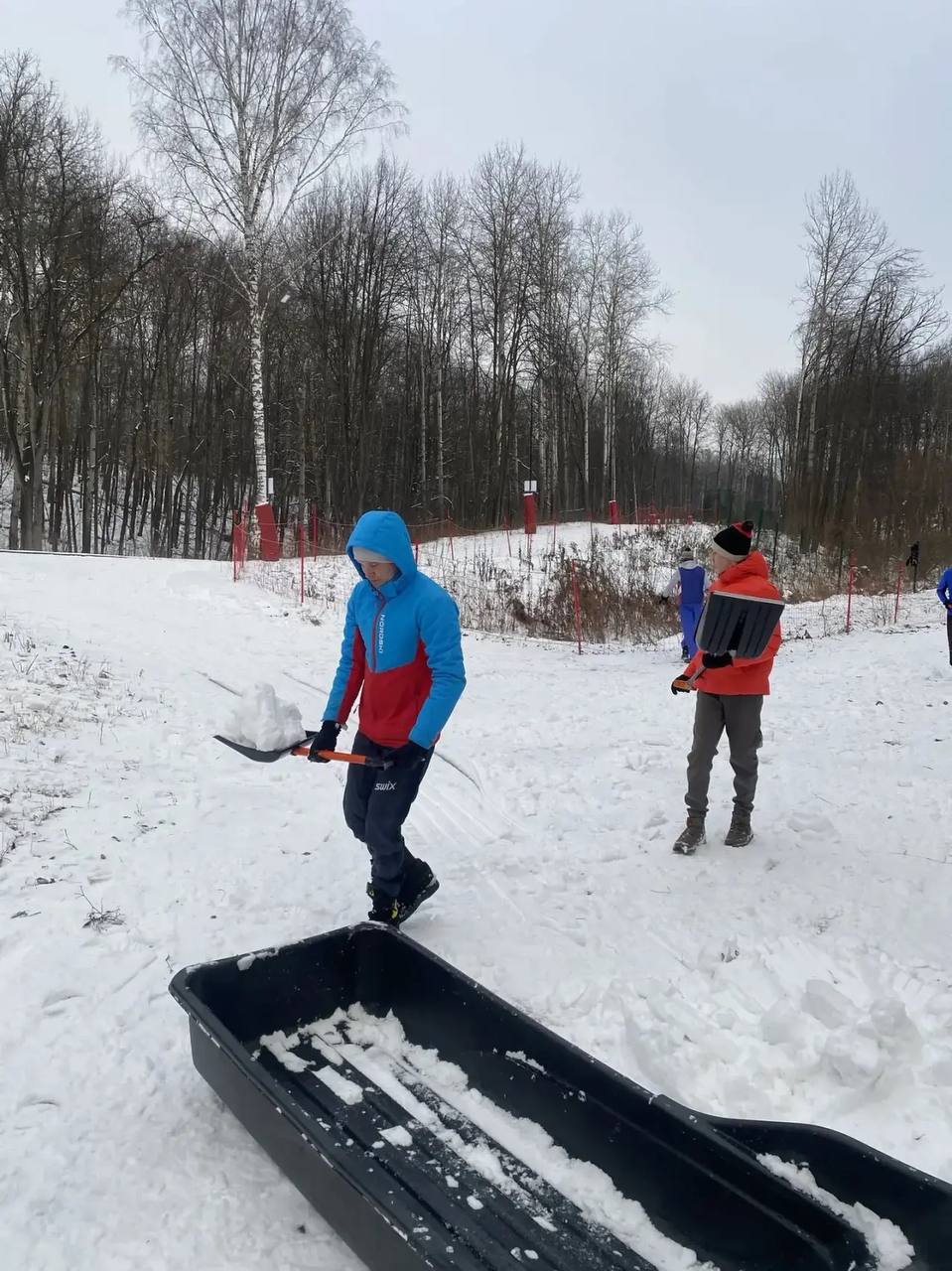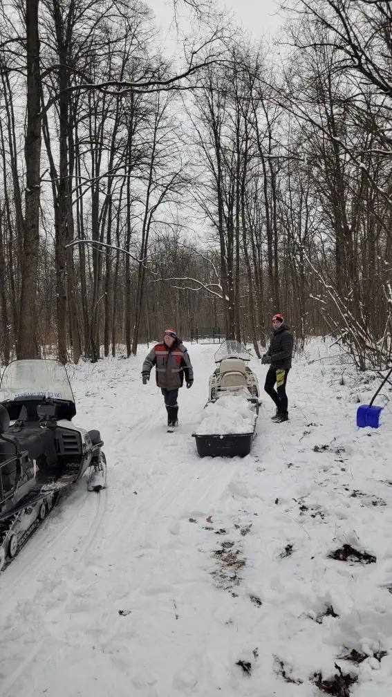 Снег свозили отовсюду куда могли пройти: из леса, с обочин и оврагов. По итогу привезли и распределили по трассе более 30 саней-волокуш снега.