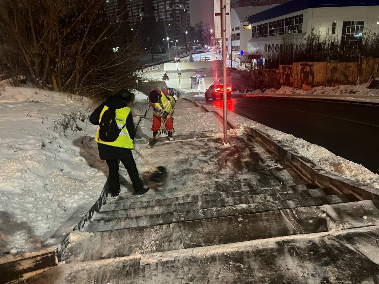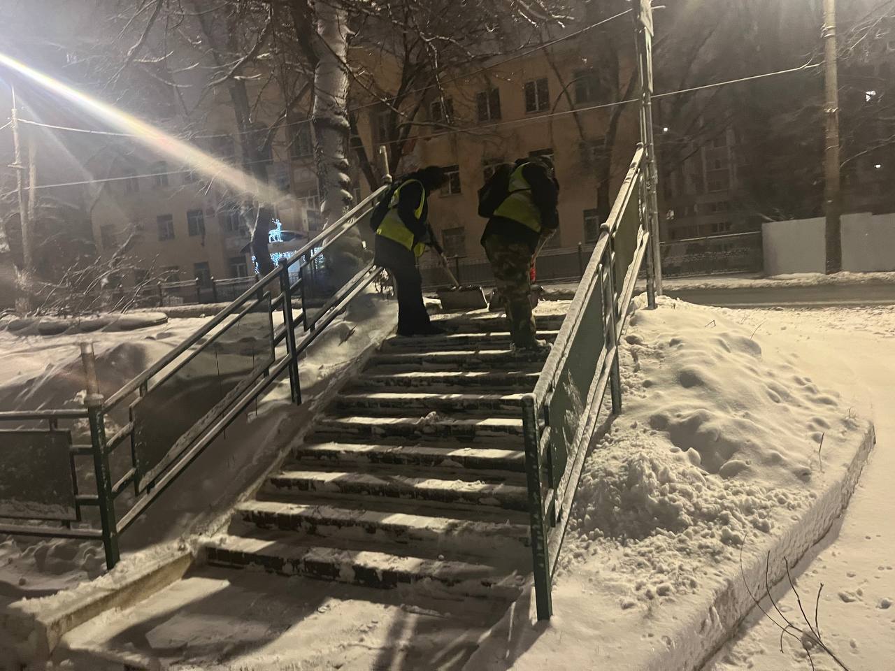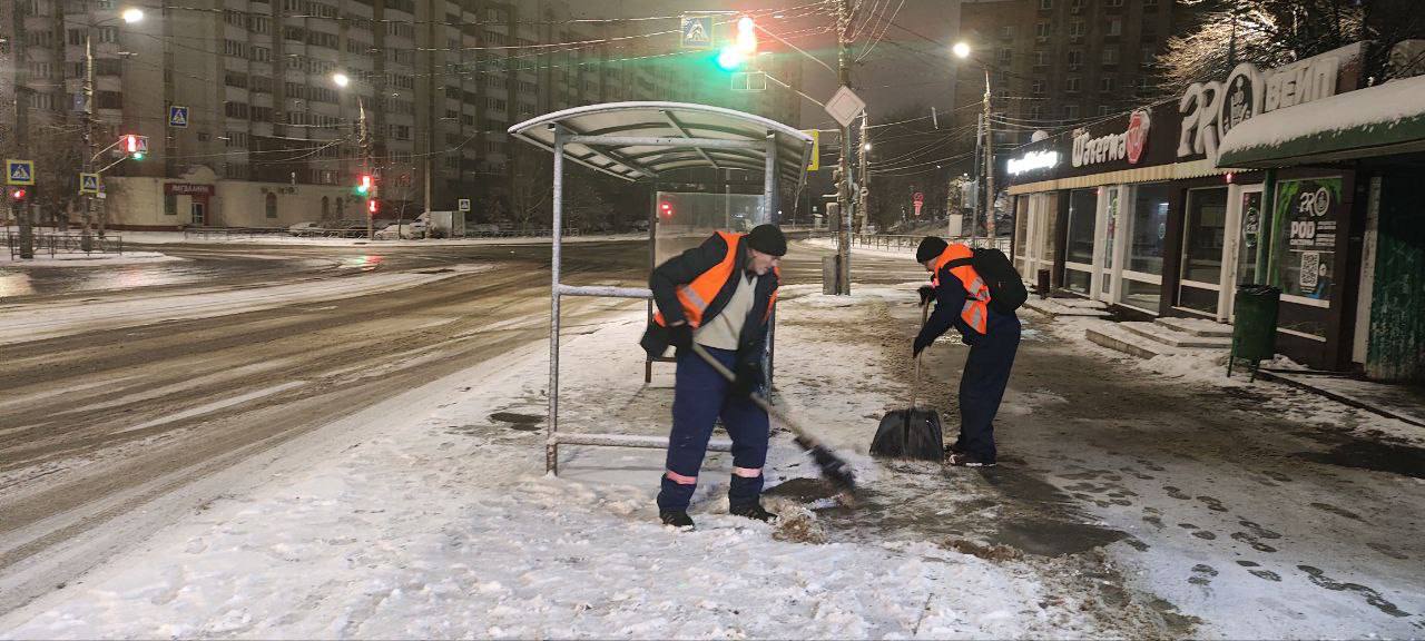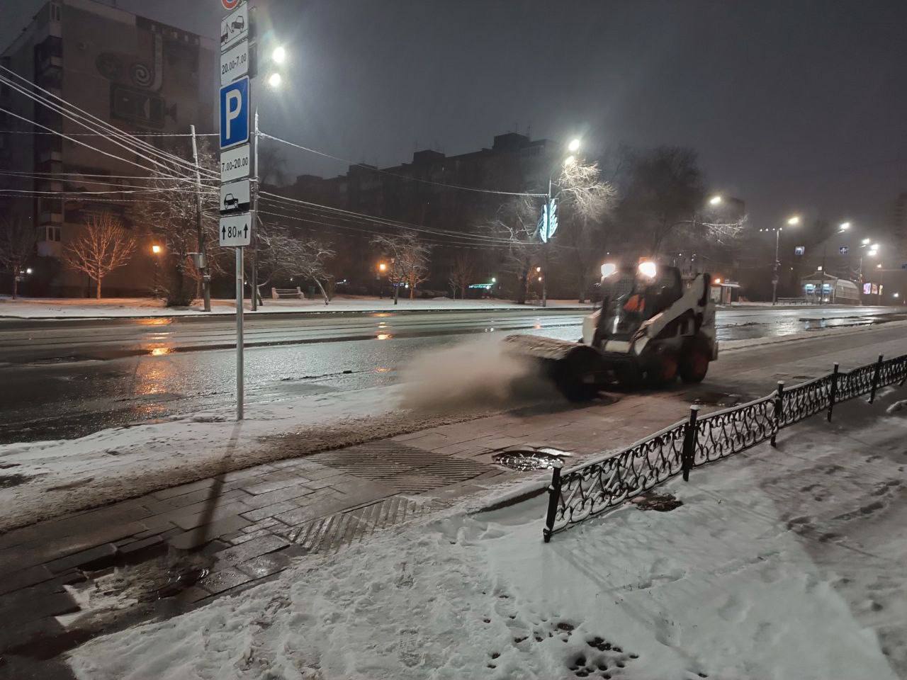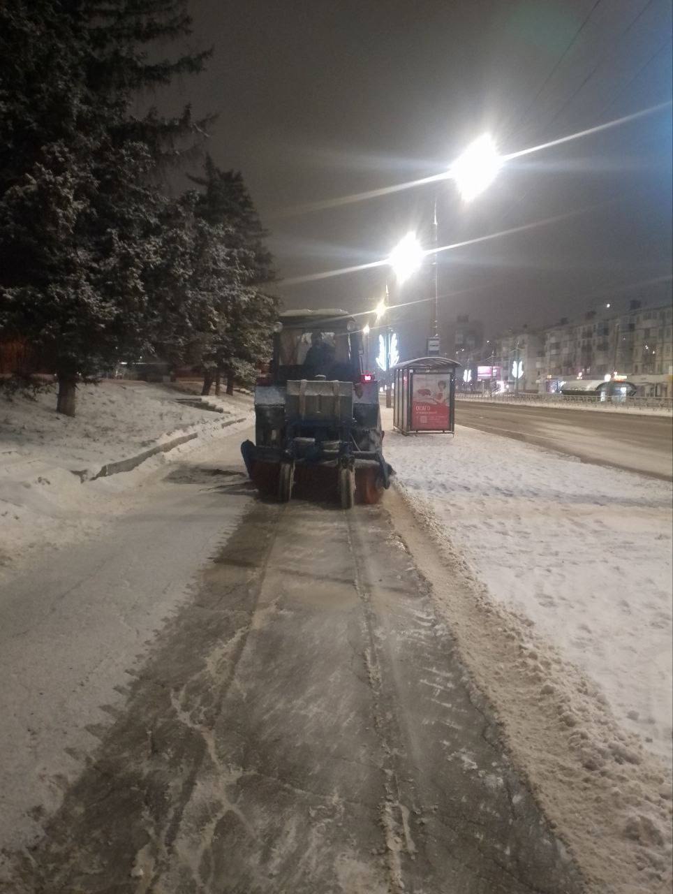 На улицы города вышла снегоуборочная техника. На дорогах и тротуарах снег убирают с помощью механической очистки. Дворники чистят от снега лестницы и остановки общественного транспорта.