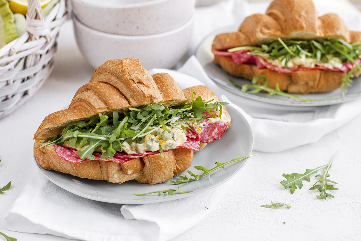 Разрежьте круассаны пополам вдоль, не до конца, чтобы создать карман. Нагрейте их на сухой сковороде, затем начините яичным салатом, добавьте салями и рукколу. Подавайте сразу же, наслаждаясь уникальным сочетанием текстур и ароматов.