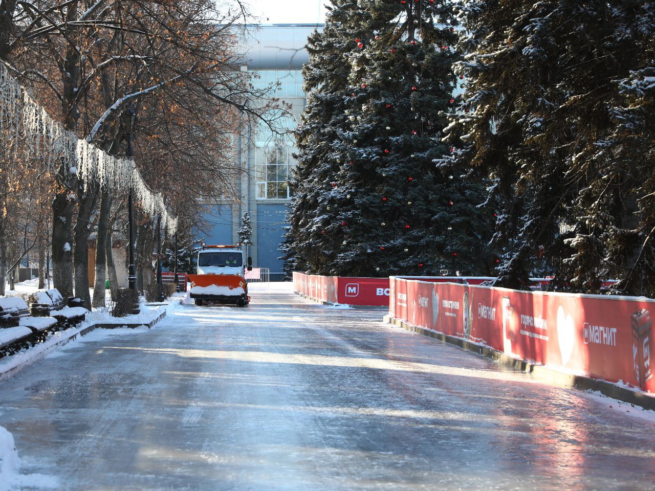 Некоторые катки уже готовы, в частности, на площади Славы и в сквере Фадеева. Четыре ледовые площадки залиты на площади Куйбышева, вчера специалисты отшлифовали лед и уже сегодня комплекс готов принимать посетителей. Это самый крупный объект такого рода в городе.