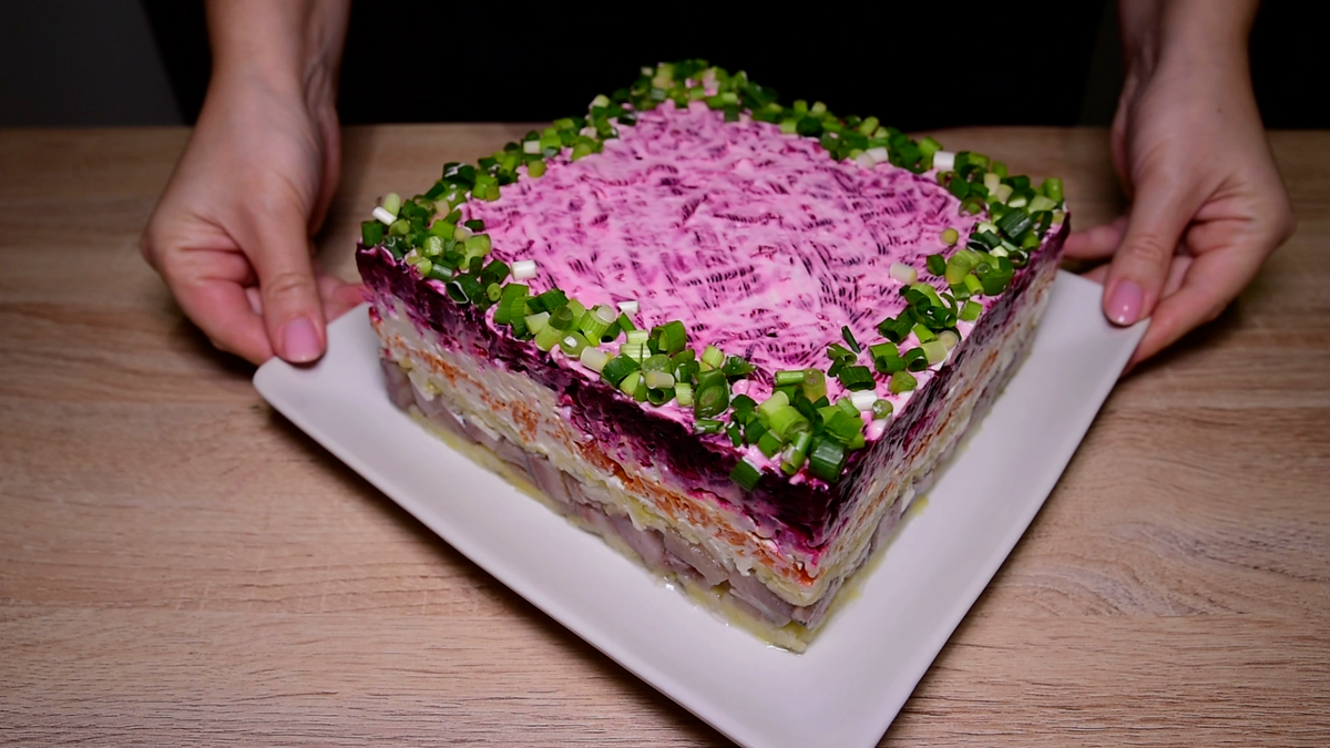 Приготовление включает запекание овощей в фольге и чередование слоев с помощью натертого картофеля, моркови, свеклы и сельди, щедро поливая их майонезом. Это простое, но эффектное блюдо становится настоящим центром внимания на праздничном столе.