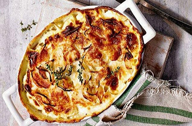 5. Выпекание. Запекать в духовке около одного часа, накрыв форму фольгой. Блюдо готово, когда верх подрумянится и начнет пузыриться, а картофель станет мягким. Проверить яство, вставив нож в середину — он должен легко проходить. Дать остыть в течение 5 минут, а при подаче украсить веточками тимьяна.