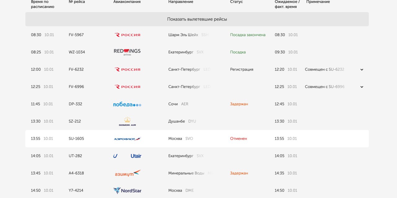 Онлайн-табло аэропорта «Курумоч» уже показывает один отменённый рейс в Москву — самолёт должен был отправиться в 13:55. Также отменён один рейс, прибывающий в Самару в 13:00.