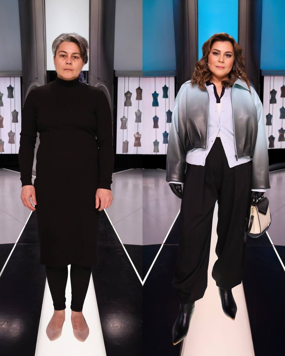 - Первый пример: Женщина на фотографии слева выглядит значительно старше, чем есть на самом деле. Темный образ с седыми волосами делает акцент на возрасте. Простое добавление светлых оттенков в верхнюю часть наряда, своевременная окраска волос и стильная укладка могут изменить восприятие в лучшую сторону.