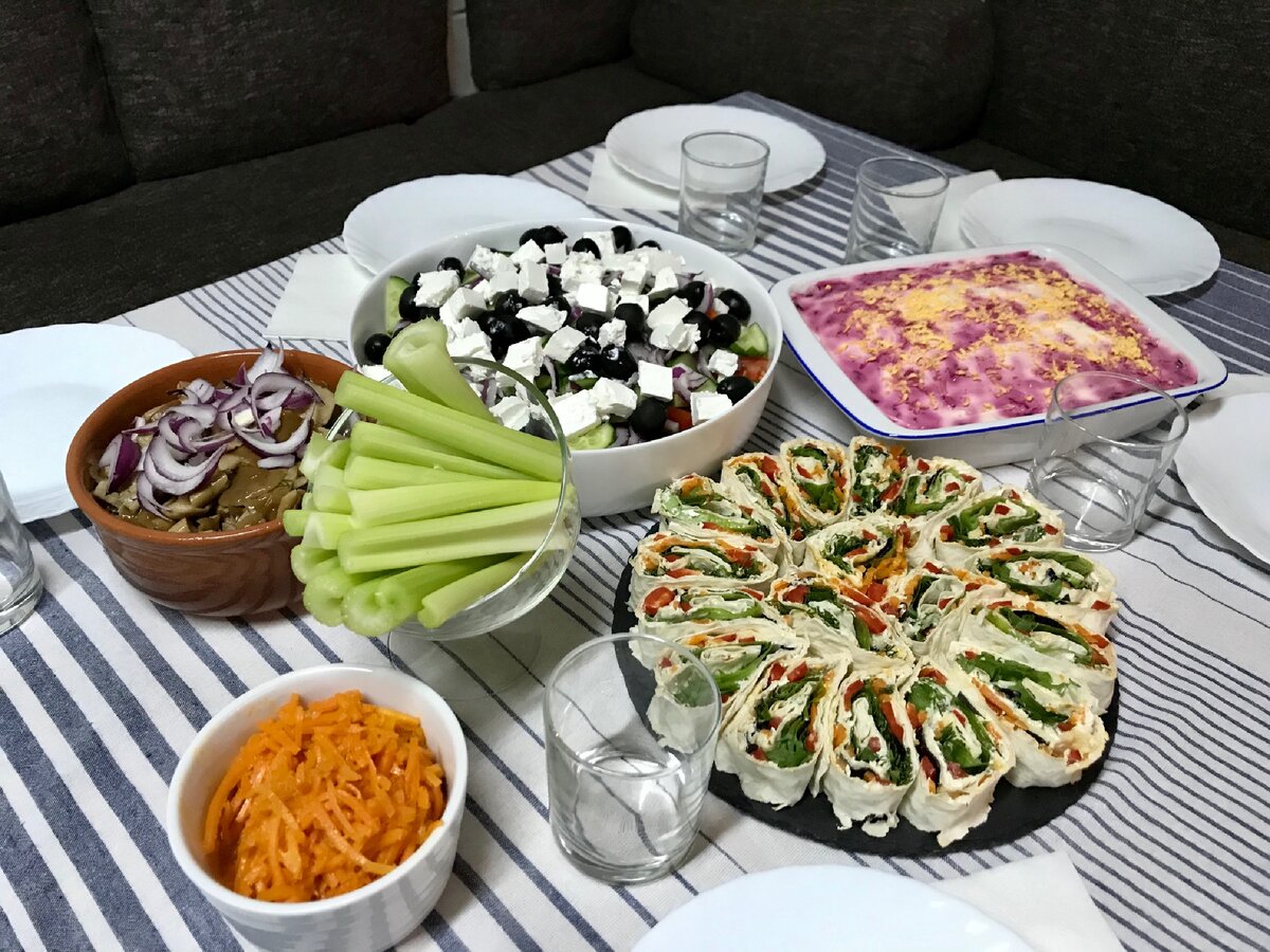 - Греческий салат – легкая и освежающая закуска, которая была подготовлена дочерью. Составляющие: огурцы, болгарский перец, помидоры, оливки и фета — идеальное сочетание для летнего ужина на свежем воздухе.