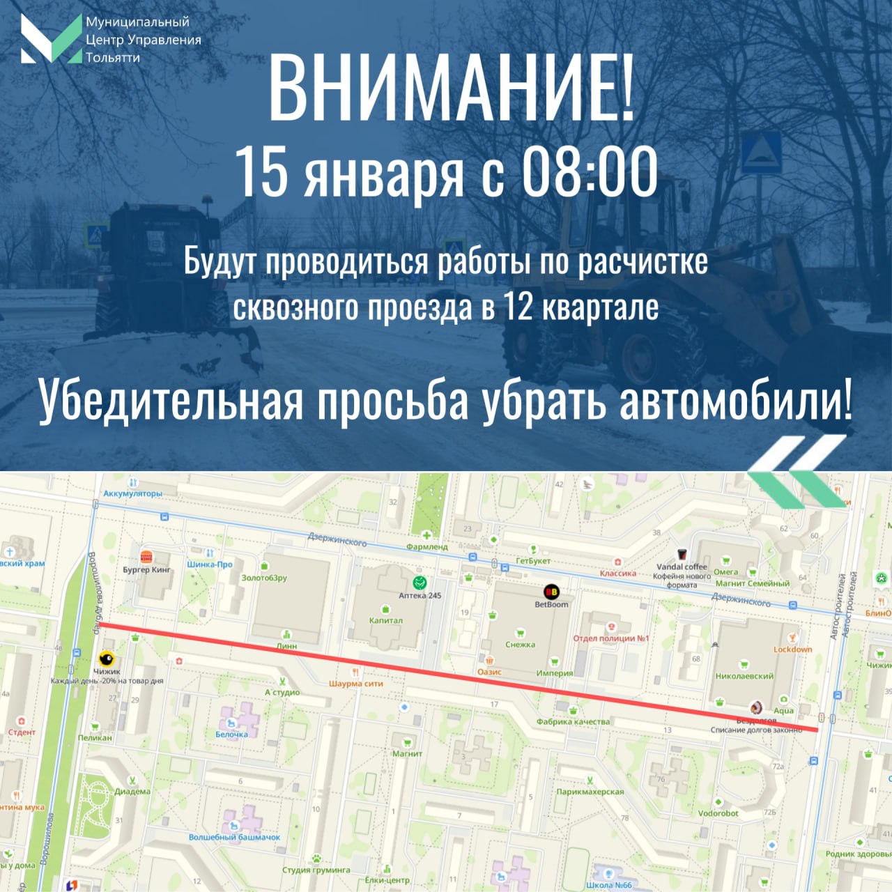 Чтобы уборка прошла максимально эффективно, МЦУ Тольятти просит убрать припаркованные автомобили. Не оставайтесь равнодушными – ваша помощь поможет сделать дороги города чище и безопаснее!