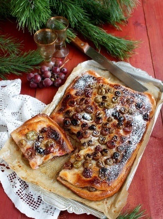 Тесто делится на две части, каждая из которых раскатывается в прямоугольник. Первый пласт покрывается виноградом и 50-60 г сахара, затем посыпается молотыми пряностями. Второй прямоугольник укладывается сверху, на него снова выкладывается виноград с сахаром и пряностями.