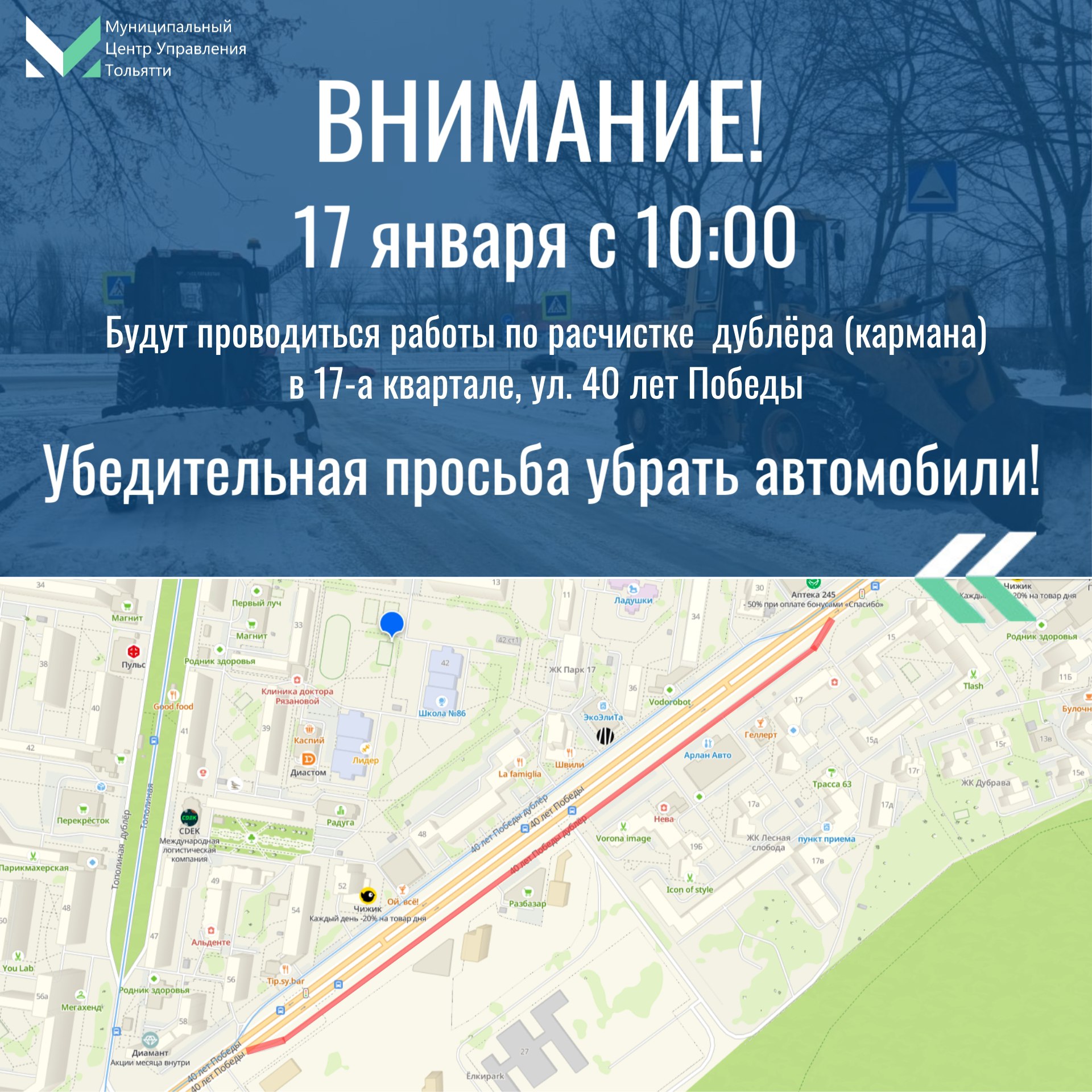 17 января запланированы работы по расчистке от снега 17-а квартал, дублёр (карман) по ул. 40 лет Победы, с 10:00