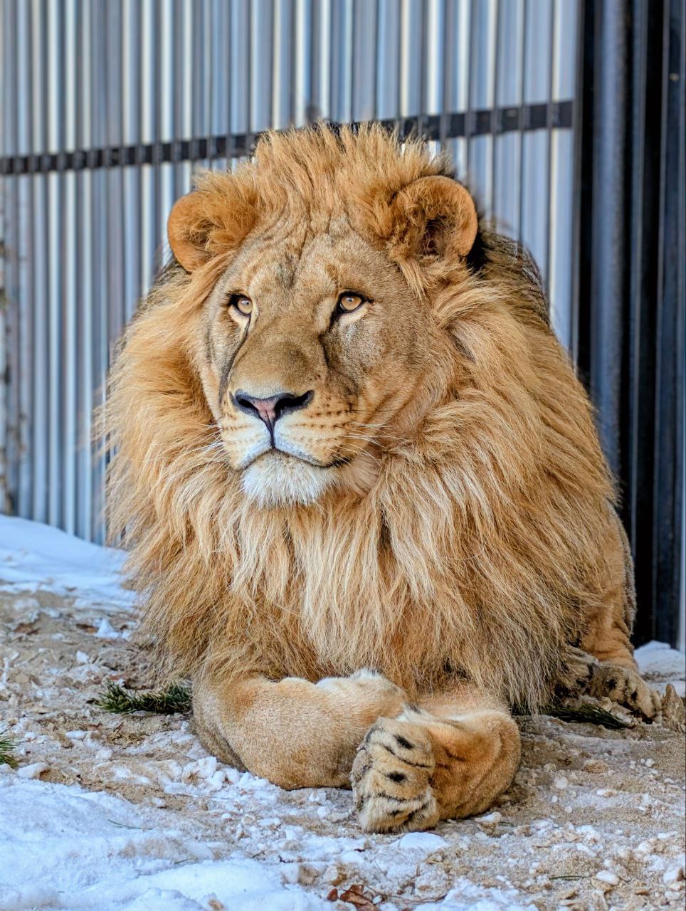 Лев Алтай тренируется в футболе, гоняя мяч по снегу. Правда, иногда лень побеждает — тогда он валяется на спине и отдыхает.