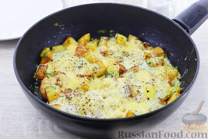 - Яичница с жареным картофелем и сыром: обжаренный картофель, ароматный чеснок и натёртый сыр создают великолепную комбинацию. Это сытное и вкусное блюдо станет настоящим открытием!