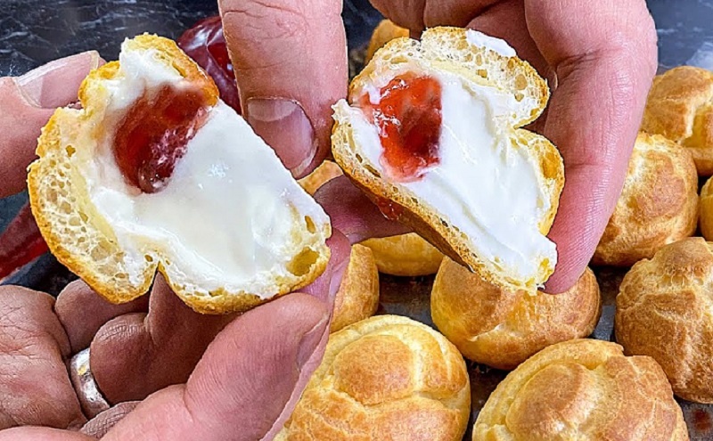 Смешав сметану с сахаром до нужной густоты и добавив многослойный ягодный джем, можно добиться поистине уникального десерта. Наполнять профитроли следует лишь после их полного остывания, что позволит аккуратно вставить две начинки, создавая эффектные слои внутри.