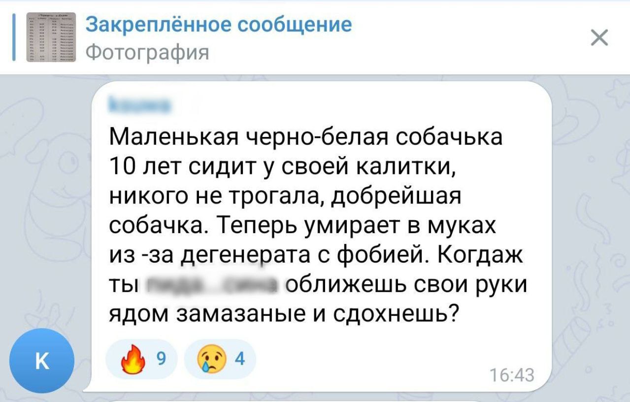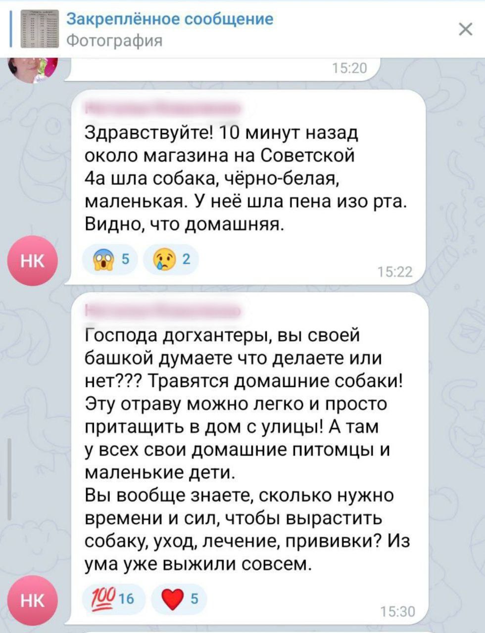 Массовые отравления собак начались в поселке еще год назад. Отраву бросали на улицах и перекидывали через забор. В этом году от рук живодера погибли несколько собак. Хозяева даже не успевают довезти любимцев до ветклиники, животные умирают в муках. Сельчан сейчас волнует не только судьба питомцев, но и собственная безопасность. Отраву рассыпают на улицах, где гуляют не только собаки, но и маленькие дети.