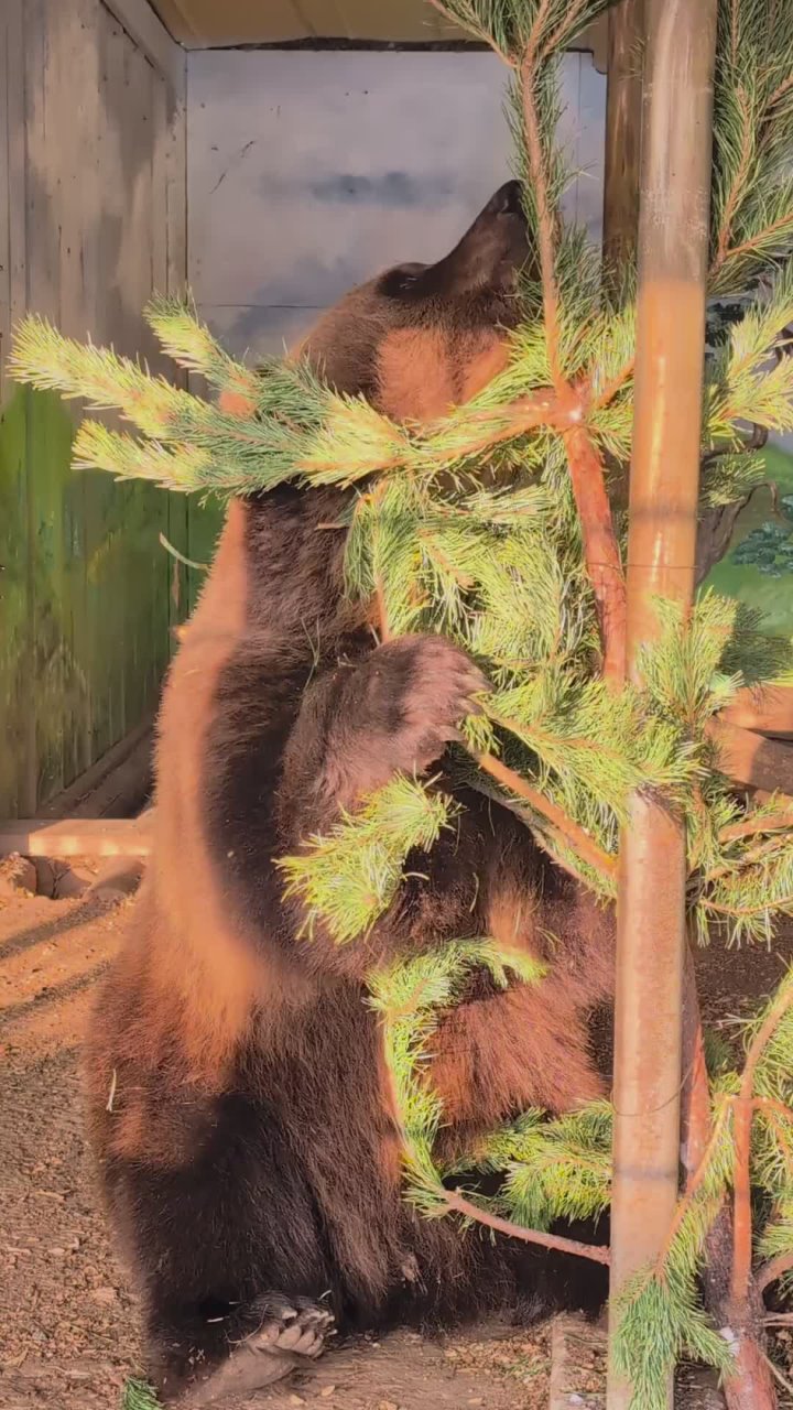 Бурый медведь Умка из Самарского зоопарка ломает очередную ёлку.