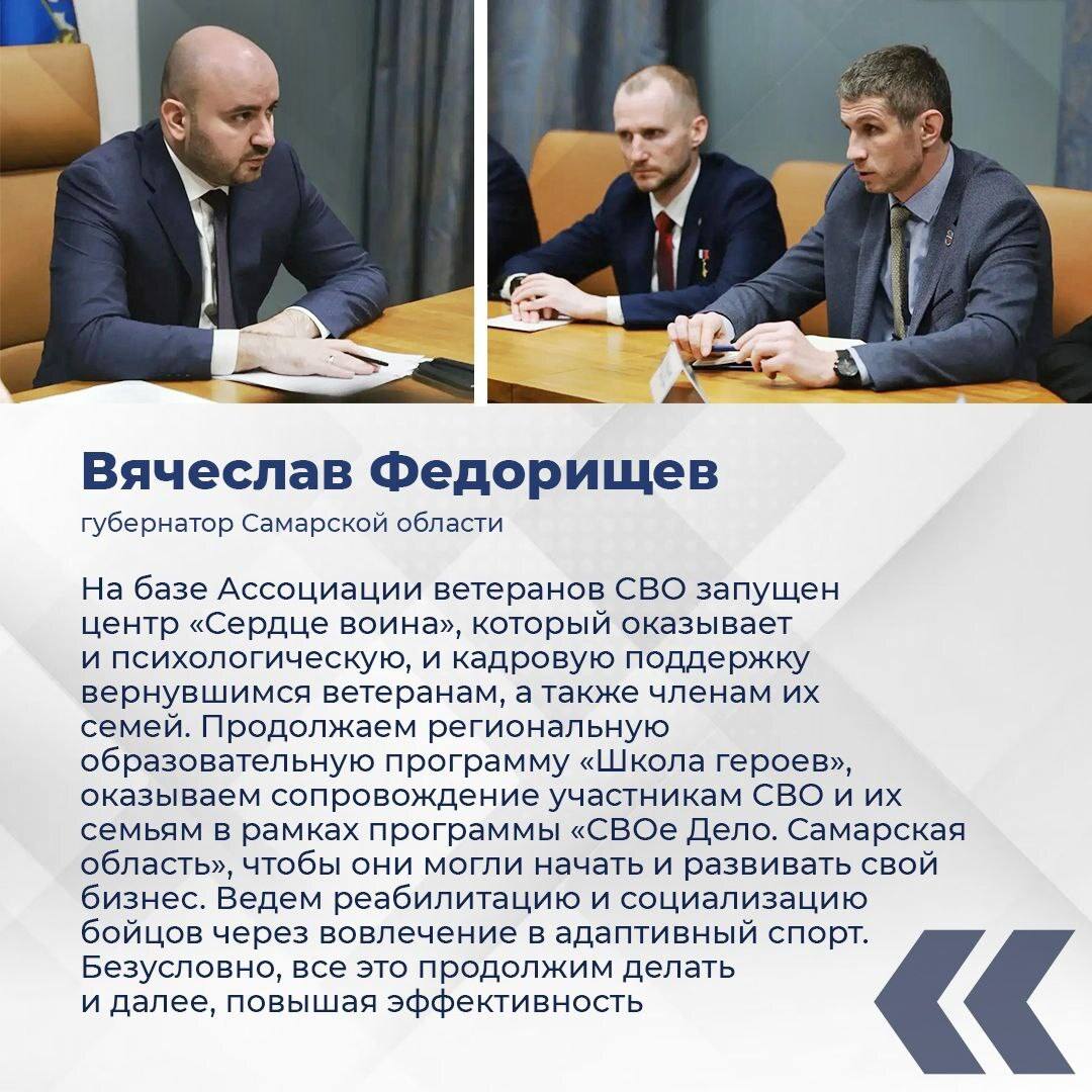 Новые практики, которые могли бы работать в Самарской области, были проанализированы в ходе встречи губернатора с руководителями Комитета семей воинов Отечества, Ассоциации ветеранов СВО, Самарской областной общественной организации ветеранов (пенсионеров) войны, труда, Вооруженных Сил и правоохранительных органов, областной общественной организации «Герои Отечества».