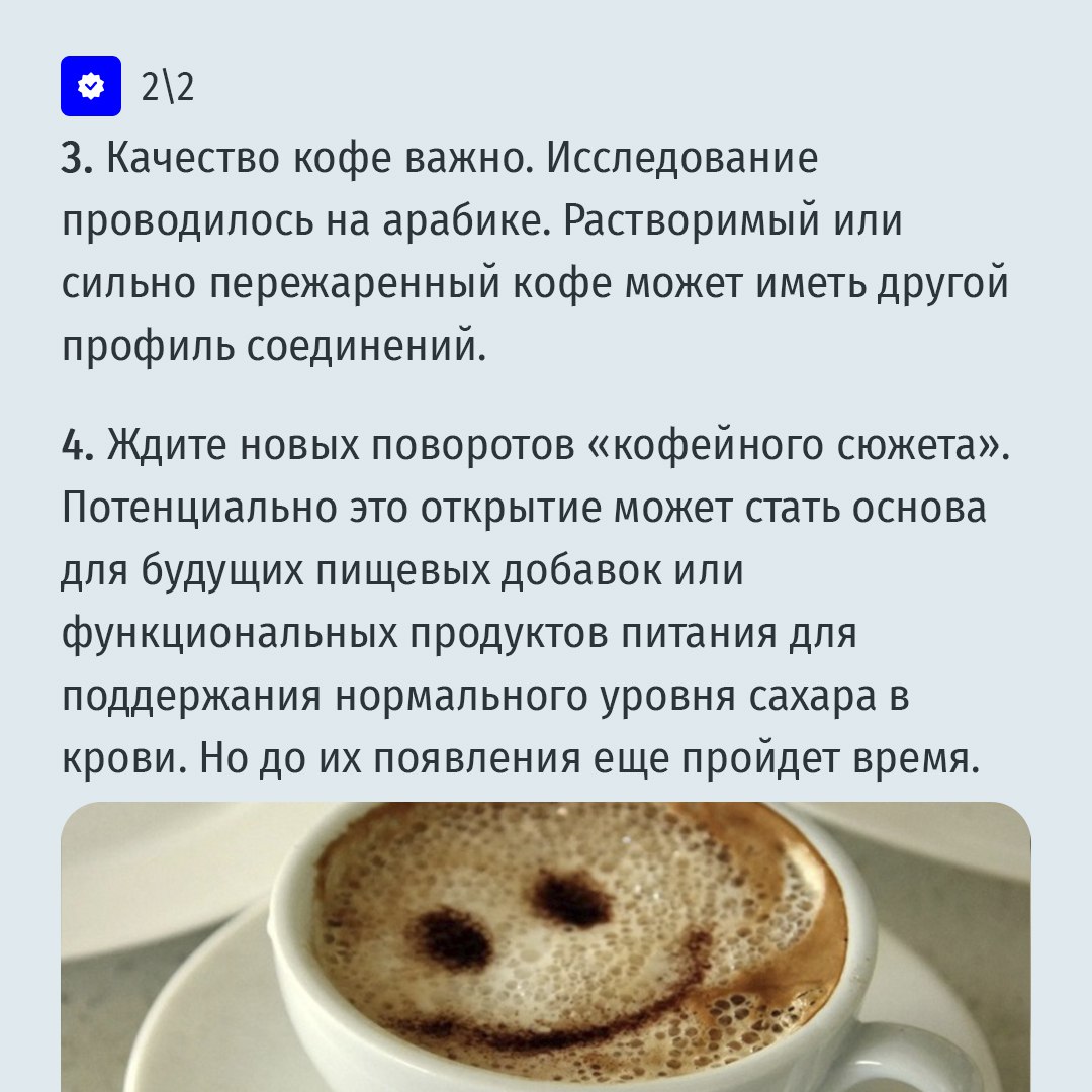 Так что начинаем усиленно пить кофе? Нет. Это исследование проведено пока "в пробирке", а не на людях. Однако новое открытие – еще один "яркий и ароматный" плюс в копилку данных о пользе кофе