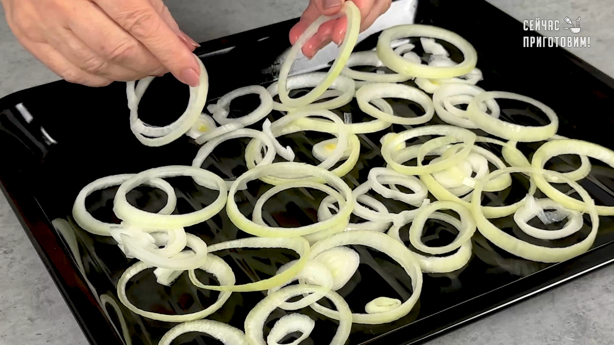 Начните с нарезки обычного репчатого лука кольцами — его следует расположить на противне в качестве основы. Далее подготовьте камбалу: рыбу необходимо очистить, удалить плавники и черную пленку. Сделайте надрезы на брюшке, чтобы она хорошо пропеклась. Уложите рыбу на лук, брюшком вверх.
