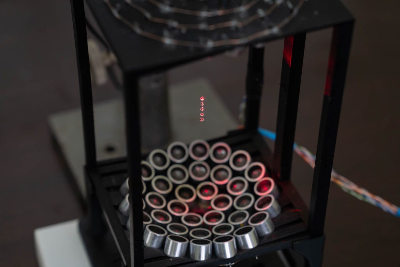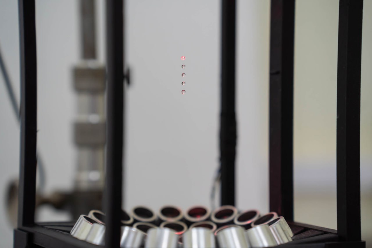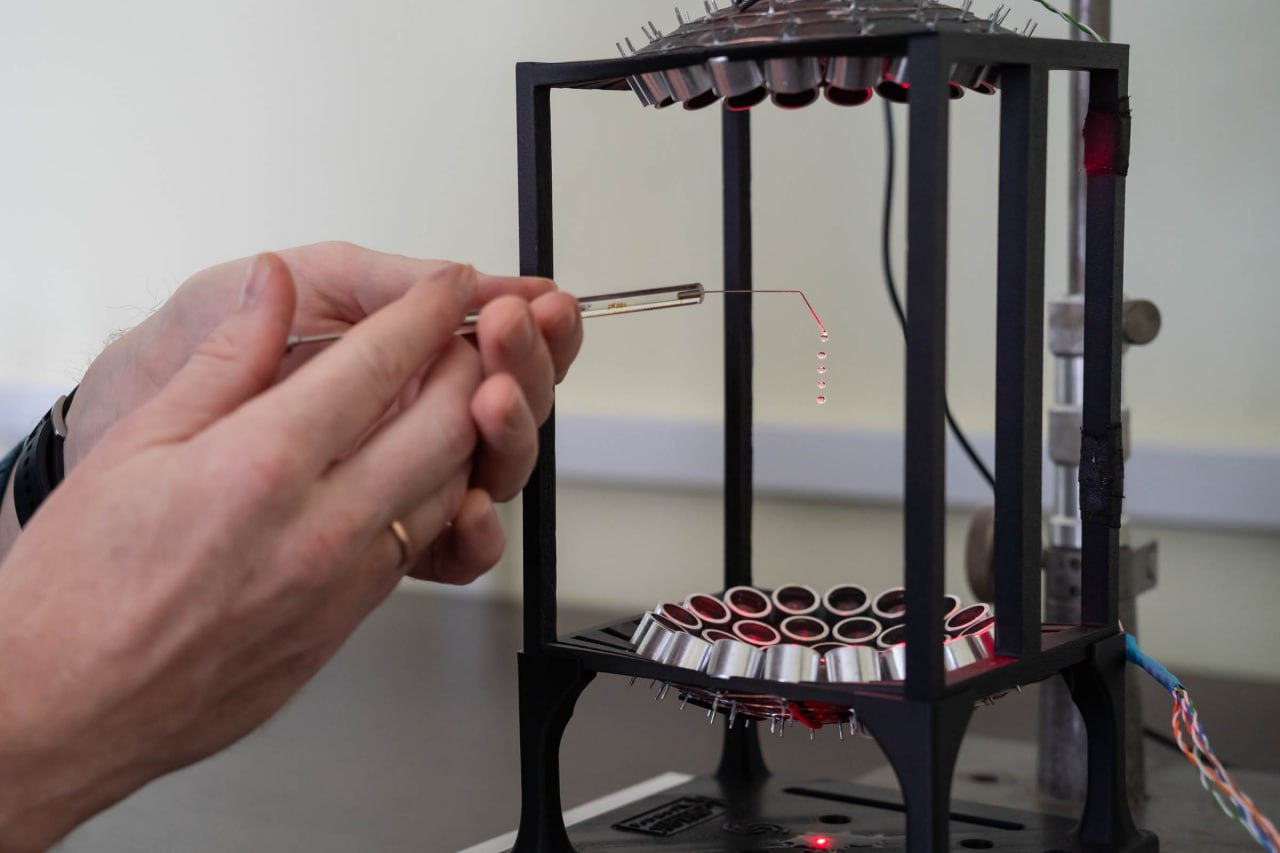 Установка позволяет проводить эксперименты с каплями различных веществ в условиях акустической левитации – когда капельки испытываемых жидкостей просто висят в воздухе, поддерживаемые полем ультразвуковых волн.