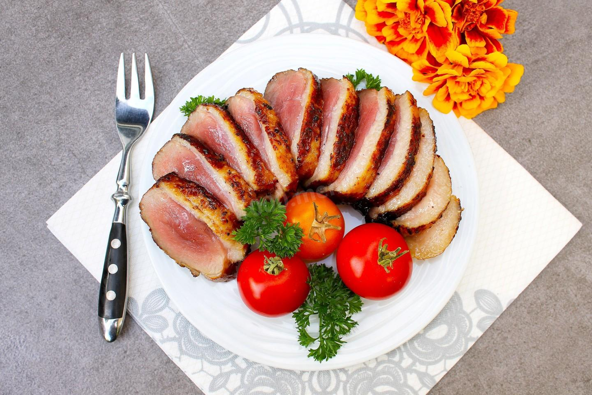 Утиное мясо богато белком и железом, а чеснок и апельсиновый сок добавляют полезные свойства блюда: укрепляют иммунитет и поддерживают обмен веществ. В такой закуске учитывается бытовой ритм: готовится быстро, не требует сложной кухни, и результат радует как поздним вечером на веранде, так и на пикнике.