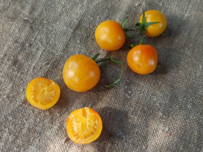Плоды имеют округлую форму и ровный размер. Цвет зрелого плода — медовый янтарь, который просвечивает через тонкую кожицу. Вкус сладковатый, без выраженной кислоты, что делает их особенно приятными для заготовок и переработки.