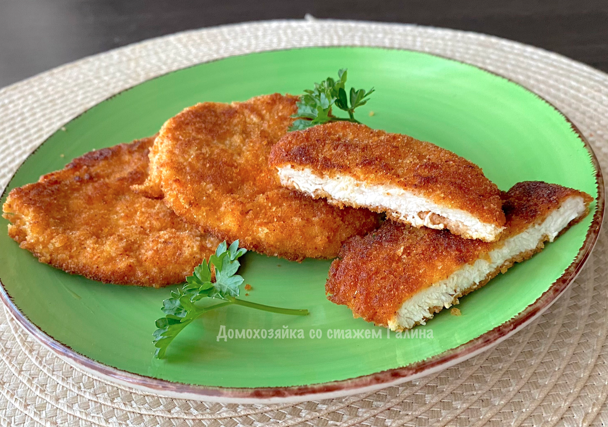 Из филе режется ровная основа для отбивных, а затем она легко и бережно отбивается, чтобы внутри сохранить сочность, а снаружи появилась та самая хрустящая корочка. Хлеб подсушивают и превращают в ароматную панировку вместе с любимыми специями, которые можно подбирать по вкусу.