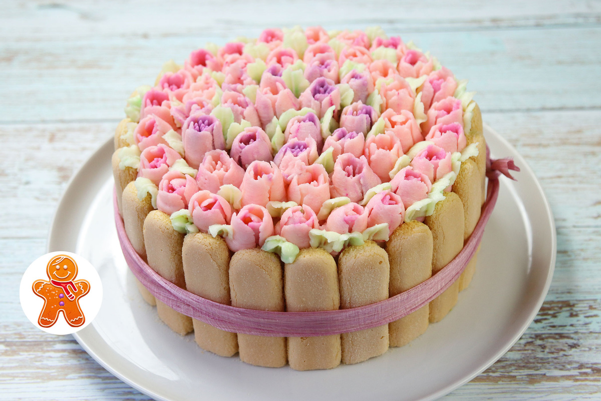 Готовый крем окрашивают частично в нежные оттенки и формируют цветы и листочки с помощью специальных насадок. В итоге торт выглядит как композиция из розовых лепестков и зелёных листьев, закреплённых на печенье и зафиксированных кольцом.