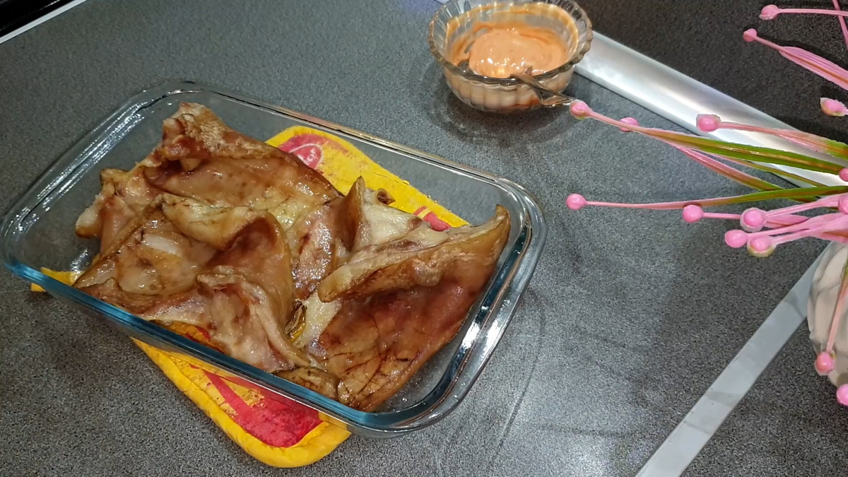 Приготовьте вкусный соус для подачи, смешав 1 зубчик мелко порезанного чеснока, 1 столовую ложку кетчупа и аналогичное количество майонеза. Когда уши будут готовы, нарежьте их на кусочки, полейте соусом и наслаждайтесь отличной закуской, которая прекрасно дополнит любой напиток.