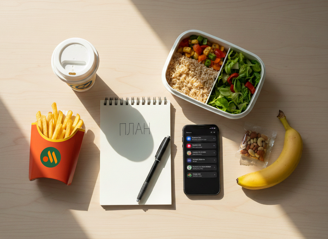 Достаточно простой совет: если готовить заранее нет возможности, позаботьтесь о небольшом перекусе. Это могут быть орехи, фрукты или йогурт. Такие закуски зачастую помогают избежать соблазна фастфуда, особенно когда голод позволяет принимать решения не в свою пользу.
