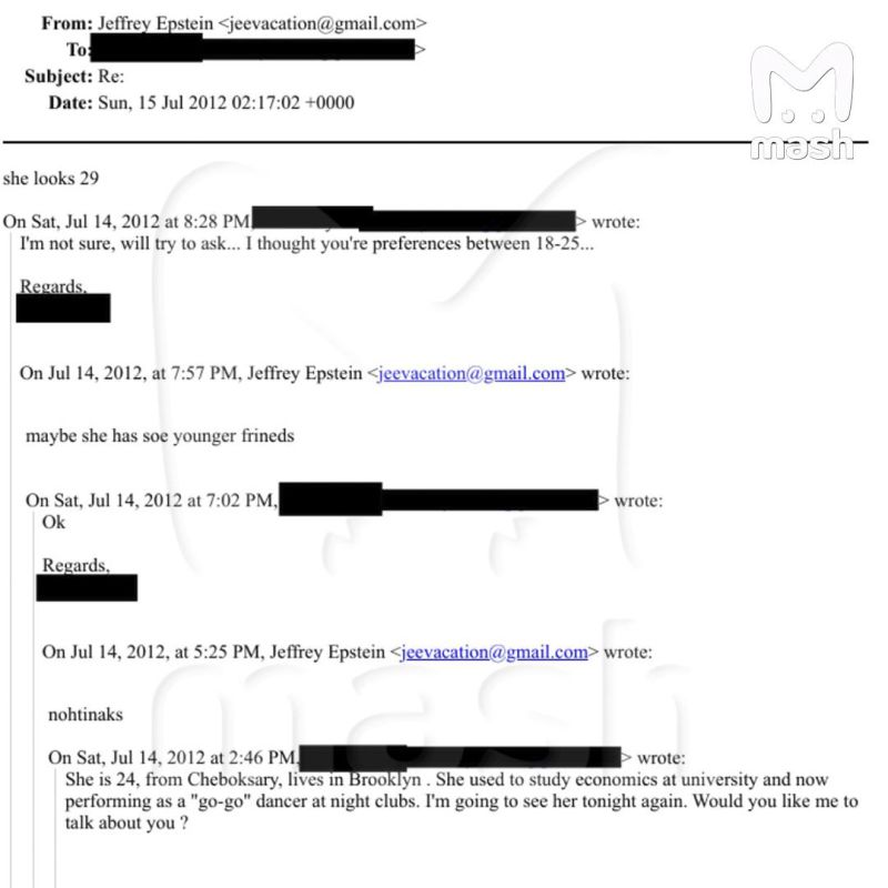 В опубликованных Минюстом США "файлах Эпштейна" Mash обнаружил модель по имени Стефания. В переписке с работорговцем агент по подбору девушек Анастасия предлагала финансисту приобрести "24-летнюю девушку из Чебоксар, которая живёт в Бруклине". Джеффри отказался — мол, "Стефания выглядит старо, нужны молодые девочки".