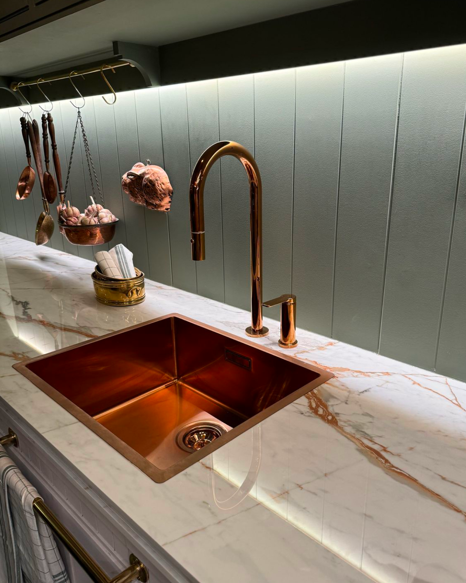- Сочетание с интерьером. Главное, чтобы цвет латуни гармонировал с фартуком, смесителем и ручками мебели.