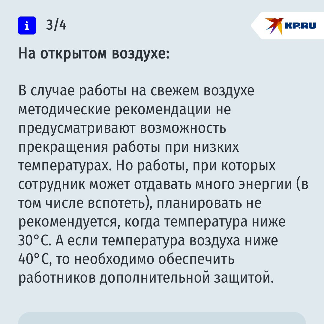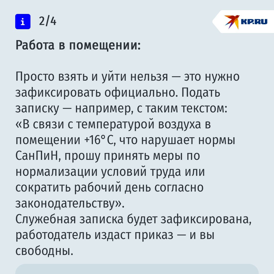 Сокращенный день или по домам— Согласно санитарным правилам и нормам, при работе в офисе (в основном за столом) оптимальной считается температура +22…+24°C. Допускается и +21°C. Если же температура ниже, то работодатель обязан сокращать рабочий день, — объясняет Александр Хаминский.