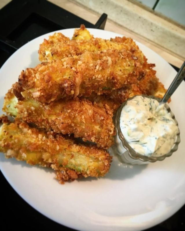 Ингредиенты: 2 свежих кабачка, 2 яйца, 150 г твердого сыра, 8 ст. л. панировочных сухарей, 3 ст. л. муки, соль, перец по вкусу, 200 г сметаны, 2 зубчика чеснока, зелень по желанию.