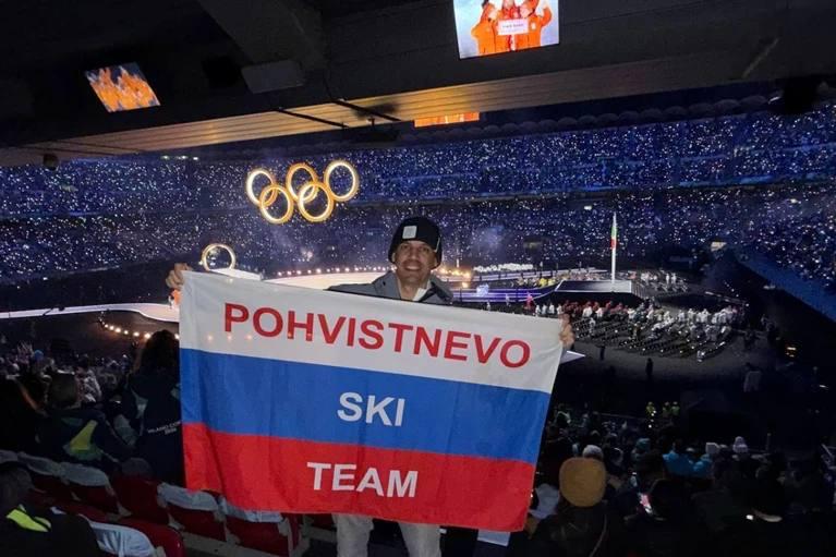 Кадры с церемонии открытия зимних Олимпийских игр в Италии появились в СМИ в минувшую пятницу, на которых среди зрителей был замечен флаг России с надписью Pohvistnevo Ski Team.